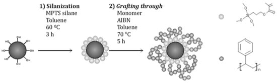 By this method, molecules presenting functional groups that are able to polymerize (silanes with vinyl groups, for example) are fixed to the surface of MNPs. In this way, NPs present in the polymerization medium are covered by the polymer. Usually, this method results in higher grafting densities compared to the grafting to technique, besides being relatively easier to perform. A kind of network is formed as polymer chains at the surface present bonds among them, due to the multifunctionality of the MNP surface [66].