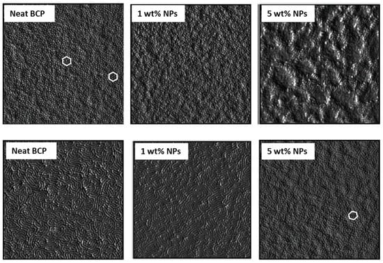 The amount of MNPs varied between 1 and 5 wt% at the nanocomposites. Thin films were annealed with saturated dioxane (selective for the PS block) vapors for several exposure times. When samples were annealed for 24 h, the hexagonal morphology of the neat BCP was maintained for the nanocomposite with 1 wt% NPs. However, by increasing the MNP amount, the morphology of the BCP was disrupted. When the films were annealed for 48 h, the neat BCP self-assembled into a stripped morphology, presenting a lamellar structure normal to the substrate. With 1 wt% MNPs, the morphology was maintained, but higher MNP amounts resulted in a nanostructure formed by cylinders perpendicular to the surface, despite some lamellae also were detected. This morphology evolution, in terms of AFM characterization, is shown in Figure 8. MNPs appeared to be well dispersed, without any agglomerations. The reason given by the authors for this evolution of the morphology was the following: as MNPs were selectively placed at PS domains (demonstrated by the elimination of the organic part by UV radiation), there was a reduction in their mobility. SQUID measurements were employed for the magnetic characterization of the nanocomposite films, showing that the magnetic properties were transferred to the nanocomposites.