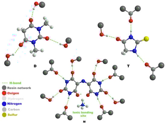 A schematic model showing the chemical structures of the healing molecules D, T, M and the hydrogen bonding interactions that they establish with the carbonyl groups (H-bond acceptor sites) and the hydroxyl groups (H-bond donor sites) of the toughened matrix.