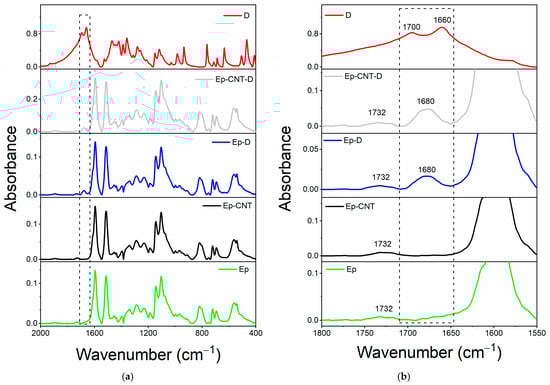 FT-IR spectra of the samples: Ep (green curve), Ep-CNT (black curve), Ep-D (blue curve), and Ep-CNT-D (light gray curve); filler D (red curve): (a) in the wavenumber range of 2000–400 cm−1 and (b) in the enlarged wavenumber range of 1800–1550 cm−1.
