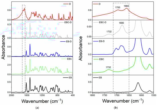 FT-IR spectra of the uncured liquid formulations: EB (black curve), EBC (green curve), EB-D (blue curve), and EBC-D (light gray curve); filler D (red curve): (a) in the wavenumber range of 2000–400 cm−1 and (b) in the enlarged wavenumber range of 1800–1550 cm−1.