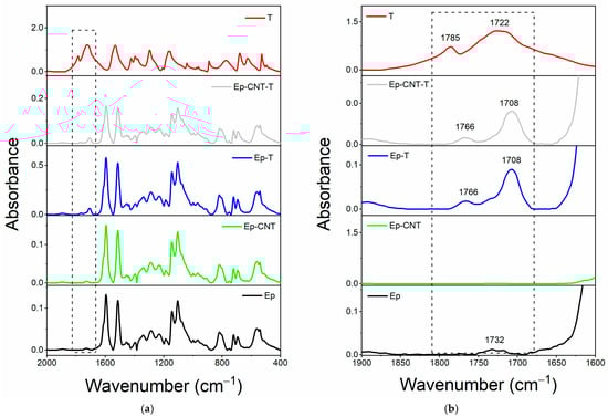 FT-IR spectra of the samples: Ep (black curve), Ep-CNT (green curve), Ep-T (blue curve), and Ep-CNT-T (light gray curve); filler T (red curve): (a) in the wavenumber range of 2000–400 cm−1 and (b) in the enlarged wavenumber range of 1900–1600 cm−1.