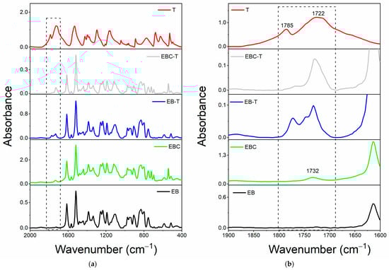 FT-IR spectra of the uncured liquid formulations: EB (black curve), EBC (green curve), EB-T (blue curve), and EBC-T (light gray curve); filler T (red curve): (a) in the wavenumber range of 2000–400 cm−1 and (b) in the enlarged wavenumber range of 1900–1600 cm−1.