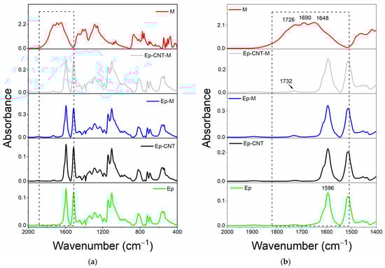 FT-IR spectra of the samples: Ep (green curve), Ep-CNT (black curve), Ep-M (blue curve), and Ep-CNT-M (light gray curve); filler M (red curve): (a) in the wavenumber range of 2000–400 cm−1 and (b) in the enlarged wavenumber range of 2000–1400 cm−1.
