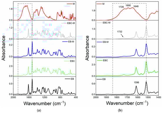 FT-IR spectra of the uncured liquid formulations: EB (black curve), EBC (green curve), EB-M (blue curve), and EBC-M (light gray curve); filler M (red curve): (a) in the wavenumber range of 2000–400 cm−1 and (b) in the enlarged wavenumber range of 2000–1400 cm−1.