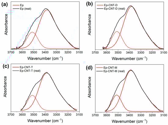 The deconvolution performed on the O-H absorbance band of the FT-IR spectra of the samples: (a) Ep; (b) Ep-CNT-D; (c) Ep-CNT-T; and (d) Ep-CNT-M.