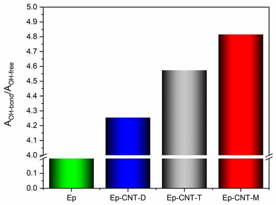 Additional FT-IR analyses were conducted on the cured samples to better illustrate the development of H-bonding interactions between the epoxy matrix and the self-healing fillers. Specifically, a thorough analysis of the absorbance bands of the OH groups has been conducted for the systems that contain both the CNT and self-healing fillers. Due to the intermolecular hydrogen bonds formed during the curing cycle, the O-H stretching signal (3200–3650 cm−1) of an epoxy resin in the solid state appears as a broad band [62]. Nonetheless, information regarding the type of hydrogen bonding interactions can be gleaned from the band profile in the vicinity of the hydroxyl groups, as well as the presence of more or less pronounced shoulders and/or additional peaks [63].