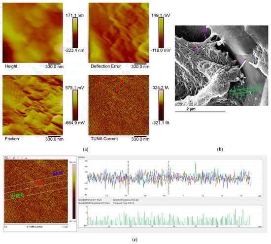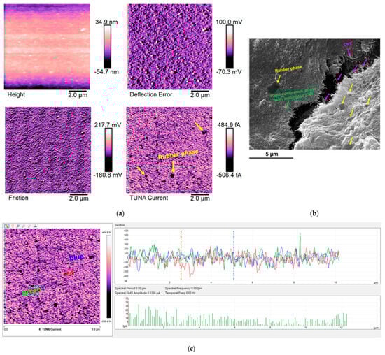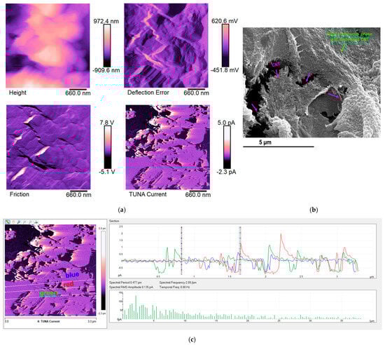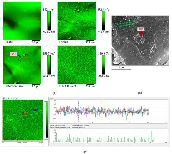 The epoxy samples (Ep) loaded with carbon nanotubes (CNTs) alone and with both carbon nanotubes (CNTs) and self-healing fillers (D, T, and M) were morphologically characterized by FESEM and TUNA. In this regard, Figure 11, Figure 12, Figure 13 and Figure 14 show the morphological representation: (a) Height, Deflection Error, Friction, and TUNA Current images; (b) FESEM image; and (c) profile of the current variations in the Ep-CNT, Ep-CNT-D, Ep-CNT-T, and Ep-CNT-M, respectively. The simultaneous acquisition of multiple TUNA images, such as Height, Deflection Error, Friction, and TUNA Current, provides a comprehensive understanding of the sample’s morphological and electrical properties [66,67,68]. In fact, by acquiring these images simultaneously, we can correlate the morphological features (Height, Deflection Error, and Friction) with the electrical properties (TUNA Current) of the sample. This complementary information enables a more detailed and accurate characterization of the sample, facilitating the identification of specific morphological peculiarities and their impact on the sample’s electrical behavior. This approach turns out to be beneficial. More precisely, the Height image provides topographical information about the sample surface, helping to identify surface features, roughness, and the overall morphology of the sample. The Deflection Error image captures the deviations of the AFM cantilever from its setpoint during scanning, highlighting fine surface details and edges that may not be visible in the Height image alone. The Friction image measures the lateral forces experienced by the AFM tip as it scans the sample, providing insights into the sample’s surface friction properties that can be related to its material composition and surface interactions. The TUNA Current image maps the local electrical conductivity of the sample by measuring the tunneling current between the conductive AFM tip and the sample surface, revealing the distribution of conductive pathways and electrical heterogeneities within the sample.
