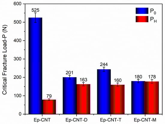 A histogram of the values of both the critical fracture load of the virgin samples () and the healed samples () for the cured nanocomposites: Ep-CNT, Ep-CNT-D, Ep-CNT-T, and Ep-CNT-M.
