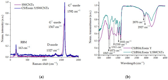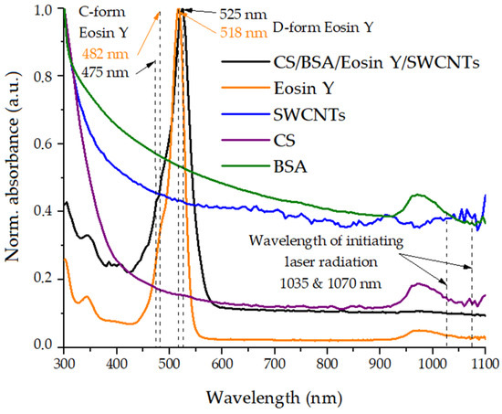- Savelyev, M.S.; Gerasimenko, A.Y.; Vasilevsky, P.N.; Fedorova, Y.O.; Groth, T.; Ten, G.N.; Telyshev, D.V. Spectral Analysis Combined with Nonlinear Optical Measurement of Laser Printed Biopolymer Composites Comprising Chitosan/SWCNT. Anal. Biochem. 2020, 598, 113710. [Google Scholar] [CrossRef]