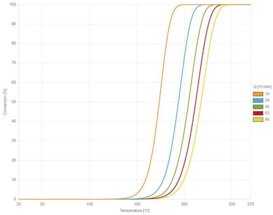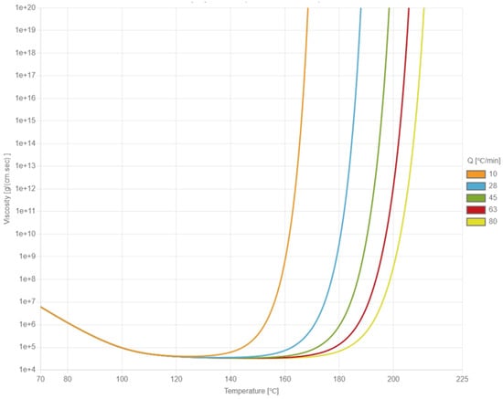 Figure 2 illustrates the relationship between viscosity and temperature under different heating rates. The fitted constants of the Cross–Castro–Macosko viscosity model are listed in