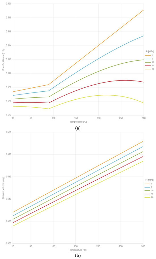 Figure 4a illustrates the P–V–T–C behavior of EMC under a fully cured state. The inflection of the curve in