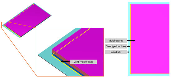 The venting is set to simulate the vacuum system during the compression molding process. The vent is positioned at the junction between the substrate and the fill area, consistent with the actual manufacturing process, as shown in