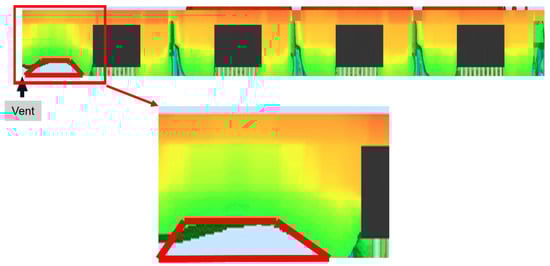 By calculating the above equation, the void area between the die and the substrate in each unit is approximately 11 × 11 µm2. According to the simulation result, it can be inferred that the void formation occurs at the center of the solder ball array between the die and the substrate, consistent with the experimental result. However, the reasons why only the leftmost units were detected with voids have not been found. Through discussions with the manufacturer, it is hypothesized that the asymmetry of the strip and vacuuming during the compression molding process causes the void formation in the leftmost units. Therefore, the simulation of the 1/5 strip with venting was conducted.