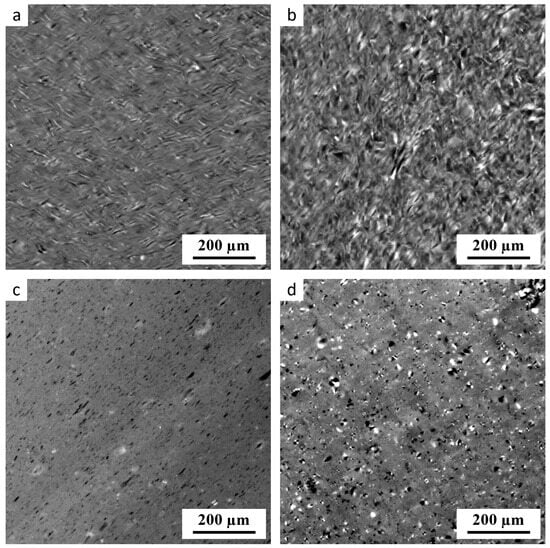 PLM micrographs showing four thermoplastic starch samples: (a) TPS-AH-0min after SC, (b) TPS-AH-60min after SC, (c) TPS-AH-0min after SC+MM, and (d) TPS-AH-60min after SC+MM. The samples without the AH treatment (a,c) contain fewer anisotropic inhomogeneities (bright spots) than the corresponding samples after AH (b,d). The complete list of the prepared TPS samples is given in Table 1.