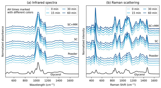 Vibrational spectroscopy results: (a) infrared spectra measured in ATR (attenuated total reflectance) mode and (b) Raman scattering measured at 785 nm excitation. Each of the two plots shows, from top to bottom, the following spectra: pure glycerol, original starch powders with various AH times, TPS after single-step SC preparation with various AH times, and TPS after two-step SC+MM preparation with various AH times.