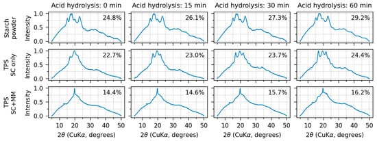 WAXS diffraction patterns and crystallinities of all investigated samples. The crystallinity values are printed in the upper right corner of each subplot. The rows show, from top to bottom, original starch powder, TPS after solution casting (SC), and TPS after solution casting and melt mixing (SC+MM). The columns show, from left to right, the studied materials after 0, 15, 30, and 60 min of acid hydrolysis.