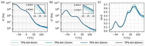 Figure 4 displays the thermomechanical properties of the final TPS samples after SC+MM. The data were obtained from oscillatory shear rheometry (Section 2.4.4) as temperature sweeps (T from −90 to 140 °C) at a constant frequency (1 Hz). All four samples showed almost identical behavior. For the storage modulus (G′; Figure 4a) and loss modulus (G″; Figure 4b), the differences are hard to differentiate in the logarithmic scale plots. Nevertheless, the insets in Figure 4a,b document that acid hydrolysis tended to increase the values of G′ and G″ slightly in the region of a laboratory temperature around 20 °C. This agreed quite well with the results of micromechanical measurements (Figure 6 and Figure 7).