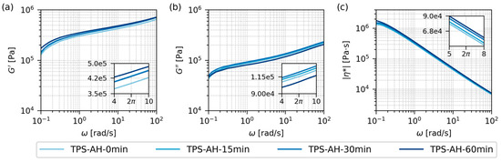 Figure 5 shows the rheological properties of the final TPS samples after SC+MM. The data were obtained from oscillatory shear rheometry (Section 2.4.5) as frequency sweeps (angular frequency, ω, ranging from 0.1 to 100 rad/s) at a constant temperature (120 °C). The selected measurement temperature corresponded to the nominal TPS processing temperature, which was preset before the melt mixing (Section 2.3.2). The extremely high molar mass of starch molecules meant that all samples exhibited a behavior typical of crosslinked polymers in the whole frequency range [17]: (i) G′ > G″ in the whole range (solid and stiff network), and (ii) |η*| decreasing monotonously from “infinitely high” values (no zero-shear viscosity plateau typical of linear polymers with common M).