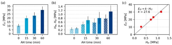 The MHI measurements of stiffness-related properties (Figure 6) confirmed that AH enhanced the overall stiffness of TPS. The clear monotonous increase with AH time was observed for EIT (Figure 6a) as well as for HIT and HM (Figure 6b). This was in accordance with both DMTA (Figure 4a) and rheological measurements (Figure 5a), in which another stiffness-related property, G’, increased with AH time as well. The trends in MHI (Figure 6) look clearer and more reproducible than in the case of DMTA and rheology (Figure 4 and Figure 5). This resulted from one important advantage of micromechanical measurements: Due to the small size of indentations (typically around 100 μm), we can perform tens or even hundreds of measurements with one specimen. In our case, the temperature sweeps (Figure 4) represent averages of 2 independent measurements, the frequency sweeps (Figure 5) are averages of 9 experiments, and the micromechanical properties (Figure 6 and Figure 7) originate from more than 90 independent measurements, as explained in Section 2.4.6. Another confirmation of the reliability and reproducibility of the MHI measurements is displayed in Figure 6c. Both theoretical considerations [58,59] and previous experimental results [39,60] suggest that many polymer systems exhibit approximate linear correlations between all stiffness-related properties. In our case, the theoretically predicted linear correlation between EIT and HIT was almost perfect, as documented in Figure 6c.