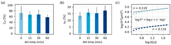 Viscosity-related properties of all investigated TPS samples after SC+MM, obtained from microindentation hardness testing: (a) indentation creep, CIT, (b) elastic part of the indentation work, ηIT, and (c) the theoretically predicted linear correlation between the squared indenter penetration depth (h2) and time (t) on a log-log scale. In (c), the light blue squares represent the TPS-AH-0min sample, the dark blue squares represent the TPS-AH-60min sample, and the thin black lines are linear regression curves. For each sample, we performed at least 90 indentations and averaged the results; the error bars represent estimated standard deviations.
