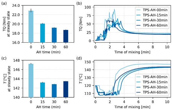 Figure 8 confirms that the AH could decrease both torque and processing temperature. The observed decrease was moderate for both quantities (Figure 8a,c), but even a few degrees can save a considerable amount of energy in large-scale applications [64,65] or improve the persistence of temperature-sensitive admixtures, such as antibiotics [31,33]. The TQ-t curves (Figure 8b) and T-t curves (Figure 8d) exhibited a steep change when TPS was added to the chamber during the first 2 min: TQ increased from zero (as we need enough energy to mix the cold and stiff material), and T decreased from the nominal 120 °C (as the source TPS, which was kept at ambient temperature, cooled the mixing chamber). After ca. 6 min of mixing, the TPS systems achieved a steady state (a plateau on TQ-t and T-t curves), where TQ decreased (the heated and homogenized material required less energy to flow) and T increased (a dissipation of energy due to internal friction of the flowing viscous material in the filled chamber). The average values of TQ and T in Figure 8a and Figure 8c were taken from the plateau regions of the TQ-t and T-t curves in Figure 8b and Figure 8d, respectively.