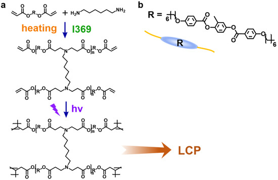 (a) The synthesis route and molecular structure of LCP; (b) chemical structural of the mesogenic unit R.