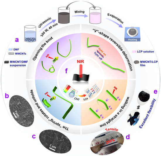 MWCNT/LCP nanocomposites proposed here were employed for s-actuators that can imitate diverse motion modes found in nature, and their schematic preparation process is illustrated in Figure 2a. Mesogens were used as the light-sensitive phase transition units, hexanediamine and I369 as the chain extender and photo-crosslinking agent, respectively, and they crosslinked into LCP by exposure to ultraviolet (UV). The surface-functionalized MWCNTs were uniformly dispersed in fresh LCP solution by ultrasound, and the MWCNT/LCP films were obtained by heating evaporation.