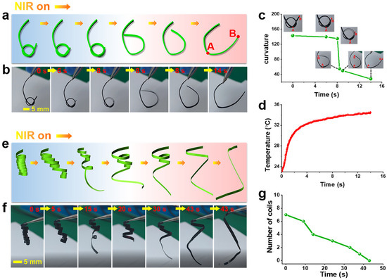 In order to study the intelligent and biomimetic performance of MWCNT/LCP for s-actuator, several s-actuator models and corresponding deformation and motion modes were designed, for instance, tying a knot on the MWCNT/LCP strip with a width of 2.5 mm and then continuously illuminating the knotted ring by NIR with a power density of 22.8 mW/mm2 (at room temperature in air). The Video S1 (Supplementary Materials) as well as photographs in Figure 4a,b show the whole process of MWCNT/LCP strip opening the knot driven by NIR. It can be seen from the photographs that the knotted ring began to expand at the 6th second of NIR irradiation and, in the next instant, the ring popped open rapidly, freeing its end from the knot. As NIR continues to irradiate, the entire MWCNT/LCP strip bends into a “U” shape. Video S1 recorded the process of MWCNT/LCP opening the knot, which took only 14 s from the beginning of NIR irradiation to the “U” shape. In order to further study the deformation, two points “A” and “B” were marked on the MWCNT/LCP strip, and their positions are shown in the “U”-shaped diagram in Figure 4a. Quantitative curvature changes of arc AB during the process of opening the knot were calculated and given in Figure 4c, which shows that, under continuous NIR irradiation, the curvature of arc AB gradually decreased from 143.3 to 28.3, with a slow decrease in the first 8 s. In the 8th second, the curvature suddenly dropped from 135 to 50, which is shown as an almost vertical curve in Figure 4c. According to previous reports [30,31,32,33], MWCNTs have brilliant photo-absorption to NIR and efficient thermal conversion performance, resulting in a rapid increase in the temperature of MWCNT/LCP strip under NIR irradiation. Therefore, the liquid crystal to isotropic phase transition occurred, making the movement of LCP molecular chains easy. The temperature recorded synchronously during the MWCNT/LCP knot opening process under NIR irradiation is shown in Figure 4d, from which it can be seen that the temperature of MWCNT/LCP strip sharply increased from room temperature (22 °C) to 31 °C within 2.2 s of irradiation, followed by a slow climbing process, slowly rising to 34.5 °C from 2.2 s to 14 s.