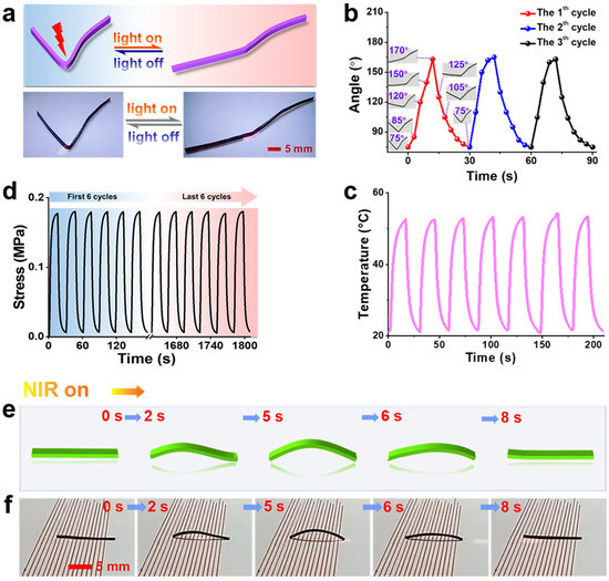 Figure 5c shows the real-time temperature response at the corner of the “V” s-actuator during reversible deformation, which demonstrates a rapid, reversible, and cyclic photo-response regulated by cyclic on/off NIR with a power density of 22.8 mW/mm2 (at room temperature of 22 °C in air). The peak of temperature rise is 53 ± 1 °C under NIR irradiation. For each NIR cycle, the temperature response is almost the same, and completely matches with the angle changes of the “V” s-actuator (Figure 5b), illustrating that the mechanism of “V” s-actuator deformation is related to its temperature changes dependent on NIR. In fact, the temperature change at the corner of the “V” s-actuator induced by on/off NIR would lead to a reversible phase transition from liquid crystal to isotropic phase of LCP in the nanocomposites at the micro level. In the amorphous isotropic phase (heating up), the molecular chains moved very actively, while they returned to a regular state and were bound in the liquid crystal phase (cooling). Furthermore, the repeatability and stability of reversible deformation of “V” s-actuator were investigated by measuring the actuation stress during its reversible deformation process (Figure 5d). As shown in Figure 5d, the actuation stress exhibits a reversible and cyclic dynamic change and almost without attenuation over 60 cycles of sustained reversible deformation.