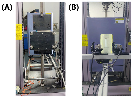 (A) Inter-ply slip measurement device for prepreg; (B) Universal testing machine with environmental chamber and DIC system.