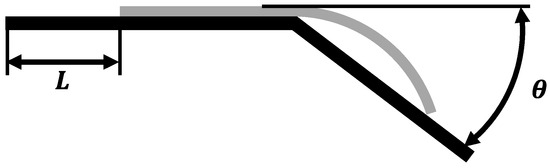In accordance with the ISO 9073-7 standard [28], a cantilever beam setup was employed to characterize the bending stiffness of unidirectional prepregs in both the fiber direction and the fiber’s normal direction. Figure 3 illustrates the schematic diagram of the testing principle for bending properties. During testing, the specimen moves uniformly to the right and deflects under its own weight. When the deflection angle reaches 41.5°, the movement distance is recorded, and the bending stiffness is calculated. The testing temperatures were set at 40 °C and 75 °C.