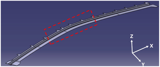 The red-framed region in Figure 4 indicates the target geometry: a 2 m doubly-curved Ω-stringer structure with complex deflections in both X-Z and Y-Z planes.