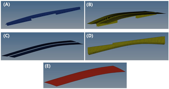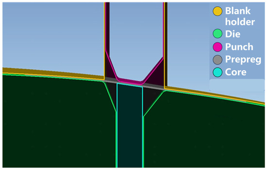 The simulation model for hot press preforming of doubly-curved Ω-stringers was constructed through the following steps: (1) Mold geometry modeling using CATIA (CATIA V5R18); (2) Finite element meshing in HyperMesh (HyperMesh 2021). The assembly consists of four functional parts: core, die, blank holder, punch, and prepreg; (3) Computational optimization of the model, which involved selective surface extraction (retaining only prepreg-contact surfaces) and geometric repair. Figure 5 presents the finalized finite element model after preprocessing.