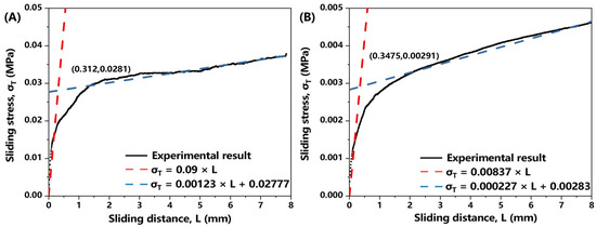 The experimental results of inter-ply slip behavior: (A) 40 °C; (B) 75 °C.