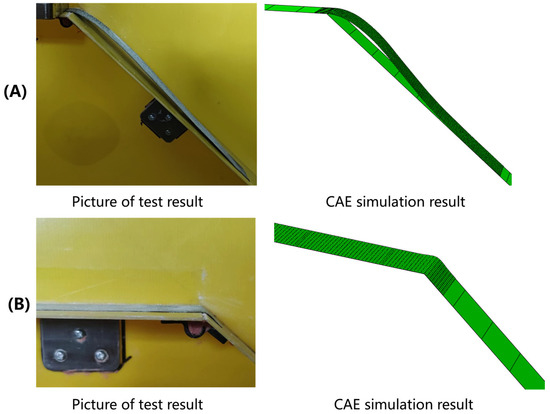 (A) Bending stiffness test result and simulation result in the fiber direction; (B) Bending stiffness test result and simulation result in the fiber’s normal direction.