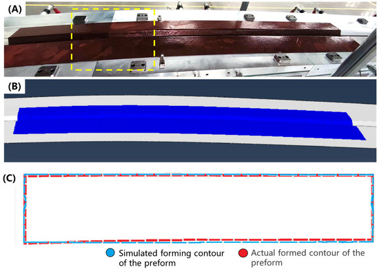 Preform of 2 m double curved Ω-stringer: (A) Picture of sample; (B) CAE simulation result; (C) Preform contour comparison with the result of finite element simulation. (The crown zone of the Ω-stringer geometry highlighted by yellow dashed box).