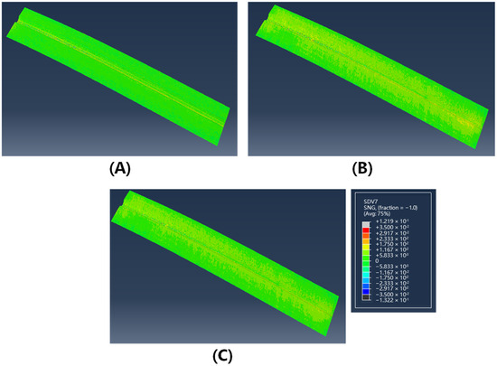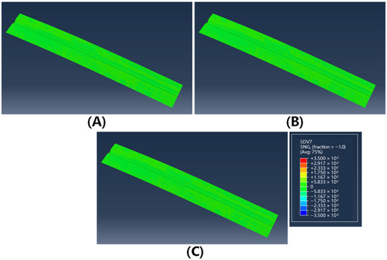 The sin value of fiber deflection angle of double curved Ω-stringer at 75 °C: (A) 0° layer; (B) 45° layer; (C) 90° layer.