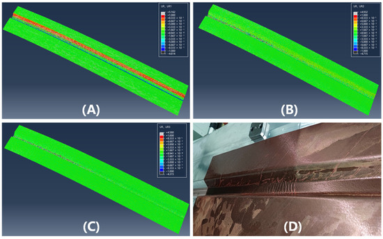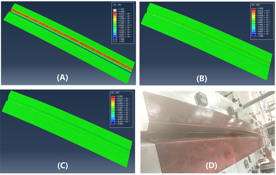 Nephograms of surface rotating parts of double curved Ω-stringer and the sample picture at 75 °C: (A) UR1; (B) UR2; (C) UR3; (D) sample picture.