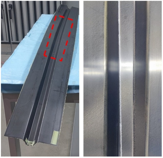 The analysis demonstrates that optimal part quality is achieved at 75 °C, which minimizes both fiber reorientation and surface wrinkling. Figure 15 presents the surface morphology of the 2 m doubly curved stringer after autoclave curing, fabricated using the optimized forming temperature. The red box highlights the critical region identified in finite element simulations as being prone to defect formation. As shown in the figure, the manufactured component exhibits excellent surface quality with no visible wrinkling defects. This observation confirms the predictive accuracy of the simulation method in capturing defect formation in composite structures with complex curvature.