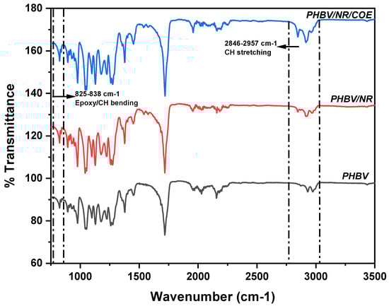 In the PHBV/NR/COE blends, several notable changes were observed compared to the neat components. The intensification of peaks at 2847 and 2920 cm−1, corresponding to CH2 stretching, could be attributed to the incorporation of COE. Interestingly, the peak at 2975 cm−1, associated with asymmetric CH stretching in the crystalline phase of PHBV, showed decreased intensity in the blends, suggesting reduced crystallinity. However, the peak at 2931 cm−1 exhibited higher intensity compared to neat PHBV due to the COE contribution.