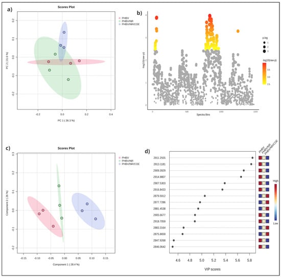 (a) 2D score plots of the PCA, showing sample clustering based on compositional similarities; (b) ANOVA results highlighting statistically significant spectral bins contributing to group differentiation; (c) PLS-DA score plot providing improved class separation among the formulations; and (d) VIP scores identifying critical spectral regions that most significantly contribute to blend discrimination.