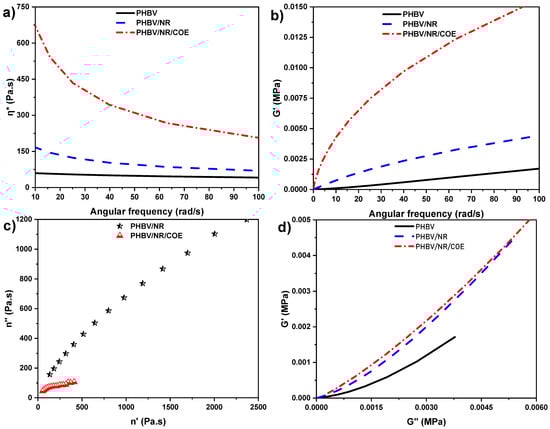 Dynamic rheological measurements indicate that PHBV/NR blends exhibit predominantly liquid-like characteristics, enhanced by COE addition. The frequency dependence of storage (G′) (Figure 4b) and loss (G″) moduli, where G′ > G″, indicates a dominant elastic response. The higher G′ values correspond to longer relaxation times in the COE blends. While COE incorporation increased G′ values, suggesting enhanced solid-like behavior, PHBV/NR/COE demonstrated higher elasticity compared to PHBV/NR at equivalent G′ values. As shown in Figure 4, neat PHBV showed liquid-like behavior, whereas PHBV blends exhibited predominant solid-like behavior at low frequencies.