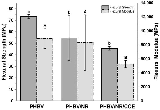 Flexural strength and modulus of PHBV and its blends. Error bars represent standard deviation (SD) based on at least ten replicates. The larger error bars for PHBV/NR are due to blend heterogeneity and phase separation. Different letters indicate significant differences between samples (p < 0.05). [Lower case letters correspond to statistical comparisons of flexural strength values, while capital letters denote statistical differences among flexural modulus measurements].