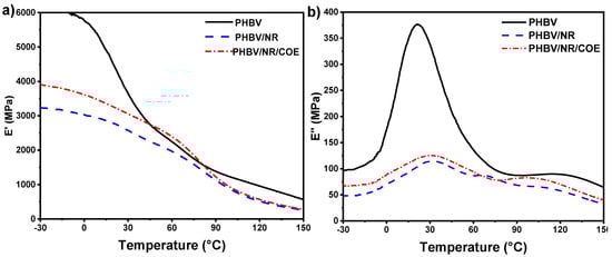 (a) Storage modulus vs. temperature and (b) storage modulus vs. temperature of PHBV and its blends.