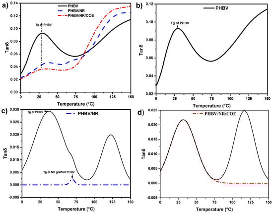 Further analysis through tan δ deconvolution provided critical insights into the phase behavior and molecular dynamics of PHBV-based blends. Neat PHBV demonstrated a single Gaussian peak (Figure 8b), indicative of homogeneous molecular relaxation processes characteristic of single-phase systems. In contrast, PHBV/NR blends exhibited two distinct peaks (Figure 8c), confirming phase separation typically observed in immiscible polymer systems. ORIGIN deconvolution analysis identified an additional peak, suggesting the presence of a molecular network with enhanced mobility compared to the primary matrix. The Gaussian function was found to provide the best fit for the experimental tan δ values of PHBV blends. While some degree of speculation and optimization was involved in selecting the appropriate deconvolution model, multiple curve-fitting approaches were systematically tested. The final selection was based on using the fewest number of curves necessary to achieve a statistically valid fit.