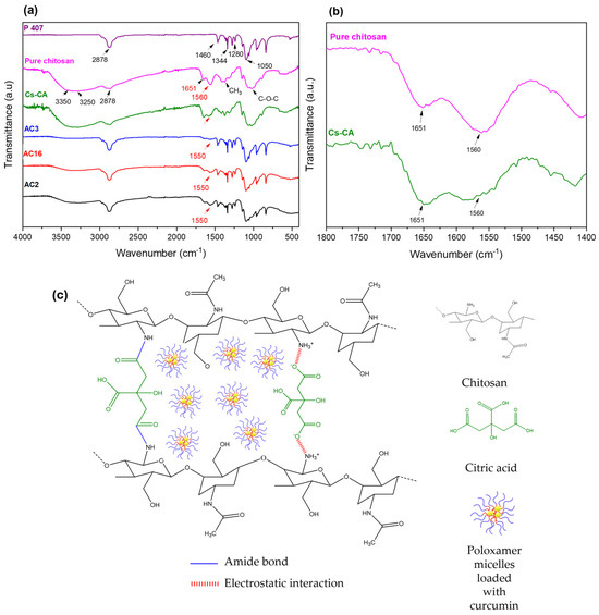 (a) Infrared spectra of cross-linked chitosan (Cs) with Cur-loaded P407 micelles (AC2, AC16, AC3); red arrows indicate the most significant shift corresponding to the N-H bond from the amine group due to cross-linking with CA. (b) Magnified view of the 1800–1400 cm−1 region for pure chitosan and Cs-CA spectra. (c) Proposed schematic representation of the cross-linked hydrogel, highlighting electrostatic interactions and amide bond formation, with Cur-loaded P407 micelles embedded in the network.