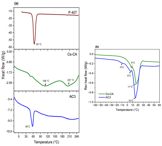 (a) DSC thermograms of P407, Cs-CA (rehydrated, 50% water), and AC3 (rehydrated, 50% water); (b) thermograms of temperature-modulated DSC (reversible heat flow) for Cs-CA and AC3 hydrogels (rehydrated, 50% water).