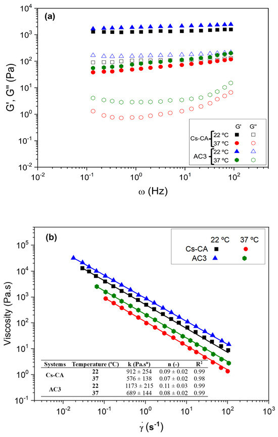 (a) Frequency sweep tests and (b) viscous flow curves performed on the different hydrogels (Cs-CA and AC3) at different temperatures (22 and 37 °C).
