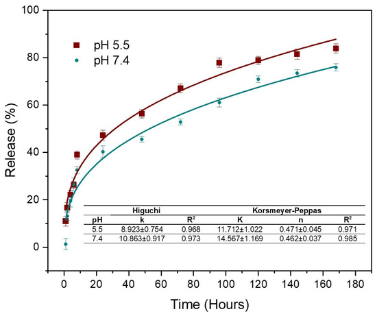 Figure 5 shows the results of Cur release corresponding to the AC3 hydrogel in buffer solutions at physiological pH (7.4) and slightly acidic pH (pH 5.5). The results indicate that there is a burst release of Cur occurring during the first 8 h, with 32% and 40% of Cur released at pH 7.4 and 5.5, respectively. This is followed by a sustained release, reaching 75% at physiological pH and 84% at pH 5.5 after 168 h. It is observed that at pH 5.5, the release is faster; this is because pH-sensitive compounds undergo a volume transition at different pH values, either swelling or deflating. In the case of chitosan, in acidic medium it can be protonated due to the presence of NH2 groups; these NH3+ units will repel each other, causing swelling in the polymer [13]. When the hydrogel contacts the medium, drug release can occur from active ingredient residues on the surface or by diffusion through the channels of the hydrogel [67]. Prolonged release is achieved for up to one week due to the second diffusion barrier for the encapsulated molecules, such as the cross-linked hydrogel [3]. The porous structure of the hydrogel acts as an efficient diffusion barrier, allowing for more sustained release [13], since the drug molecules are embedded inside the micelles, which in turn are trapped within the interconnected networks of the hydrogel [46]. The initial burst is likely due to Cur adsorbed on or near the hydrogel surface, as mentioned by Alibolandi et al. [28], who evaluated Cur-loaded micelles in dextran hydrogels. Subsequently, the process becomes more controlled. At pH 7.4, the release reached 40% within 24 h. The results show that the release of Cur from the CA-cross-linked Cs hydrogel follows the Korsmeyer–Peppas model, with an exponent n very close to 0.5, indicating anomalous transport; that is, in addition to a diffusion mechanism, a more complex mechanism also participates in the release [34]. This suggests that Cur is released proportionally to the square root of time, implying a rapid initial release that progressively slows down. This behavior is consistent with a stationary hydrogel matrix, where drug release is primarily due to diffusion from the interior of the gel into the surrounding medium. Diffusion-controlled release is beneficial for therapeutic applications, as it allows for a sustained and predictable release of Cur, improving its bioavailability and therapeutic efficacy while minimizing the need for frequent administration. Furthermore, these results have been compared with the Huggins model, confirming that the Korsmeyer–Peppas model provides a better fit to describe the release kinetics in our Cs hydrogel system.
